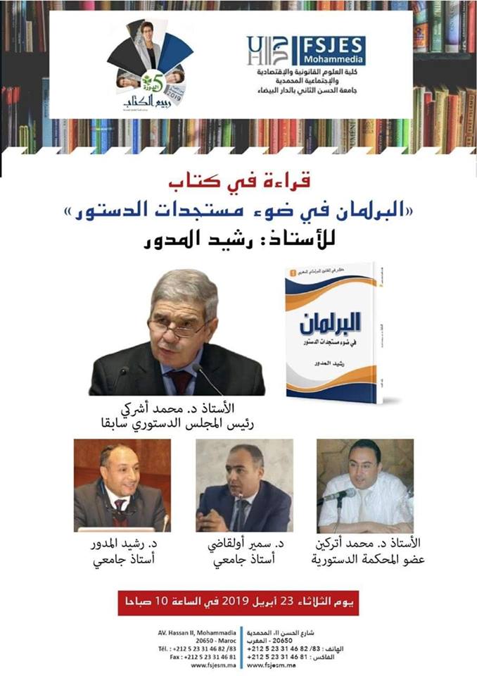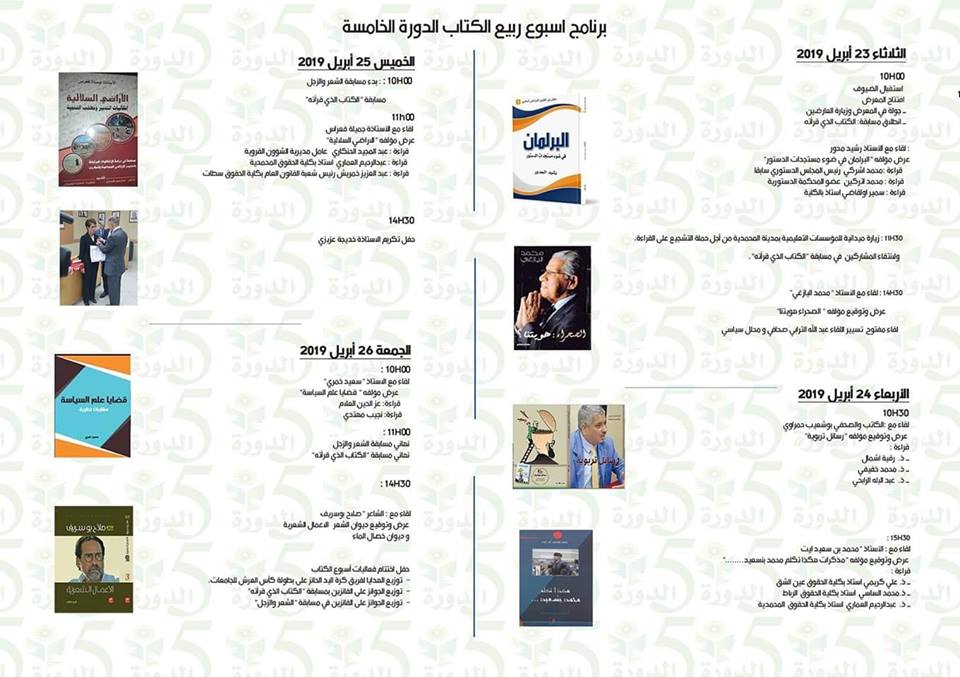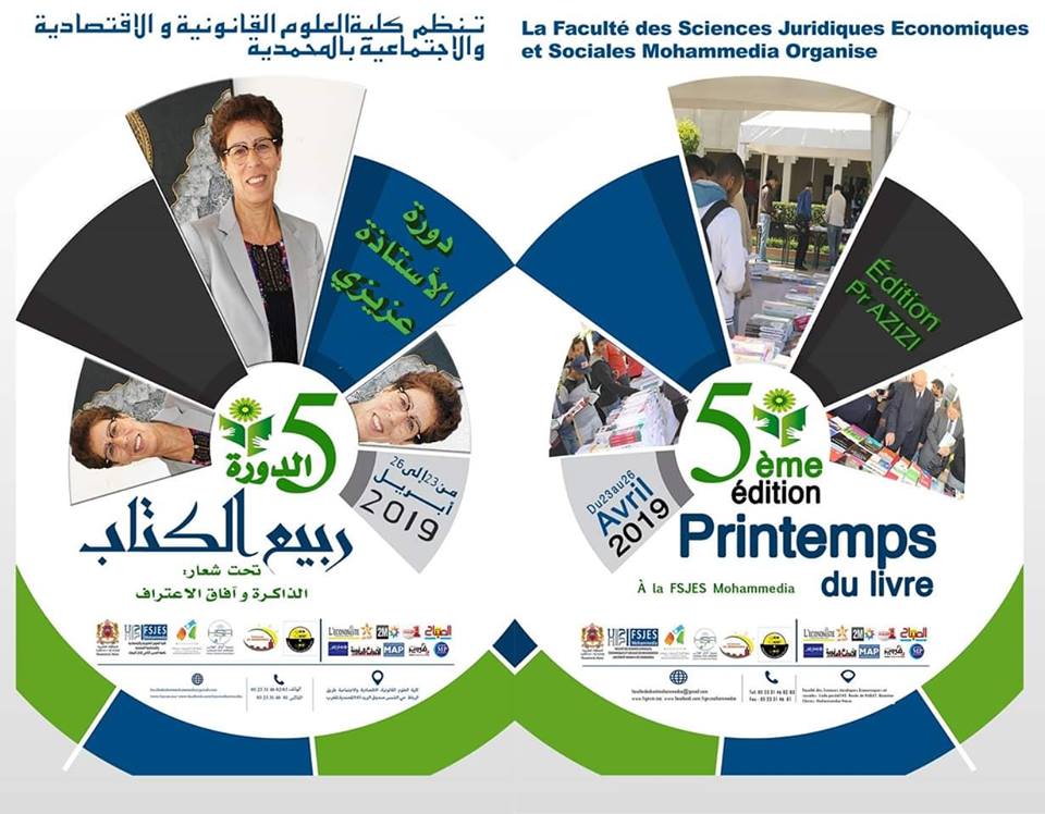 تحتضن كلية العلوم القانونية والاقتصادية والاجتماعية بالمحمدية في الفترة الممتدة ما بين 23 من ابريل الجاري الى غاية 26 منه الدورة الخامسة من أسبوع ربيع الكتاب ، وذلك تحت شعار ”الذاكرة وافاق الاعتراف“. وتعرف هذه الدورة مشاركات وحضورا للعديد من الشخصيات الوطنية والإعلامية وأيضا حضورا لمجموعة من المؤلفين. وكما تعرف الدورة الخامسة تكريم الأستاذة خديجة عزيزي عضوة في هيئة التدريس والبحث في المؤسسة تقديرا لمسارها العلمي وبمجهوداتها المبذولة في المجال المعرفي والبيداغوجي. ومن جهة أخرى تعرف الدورة الخامسة من تظاهرة ربيع القراءة تنوعا في برنامجها حيث استهلته صباح هذا الثلاثاء 23 ابريل 2019 بجولة لاستكشاف المعرض وزيارة العارضين بالإضافة الى تنظيم مسابقة ”الكتاب الذي قرأته “ بعد ذلك افتتحت اول جلسة في قراءة وتحليل كتاب البرلمان في ظل مستجدات الدستور لمؤلفه الاستاذ رشيد لمدور.