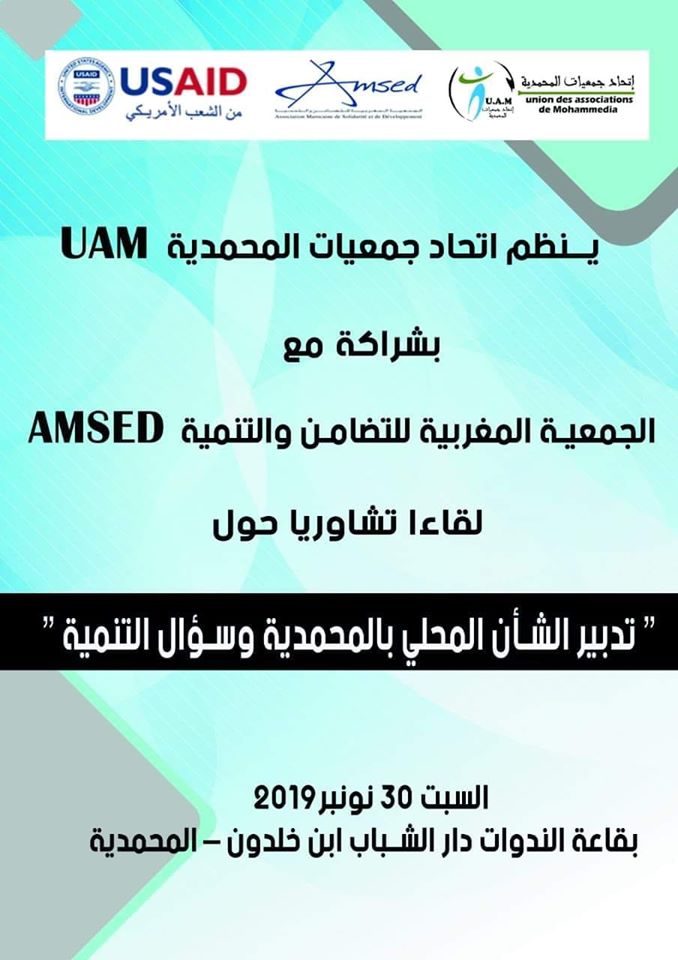 نظم اتحاد جمعيات المحمدية UAM بشراكة مع الجمعية المغربية للتضامن والتنمية AMSED لقاء تشاوريا حول ” تدبير الشأن المحلي بالمحمدية وسؤال التنمية ” بمشاركة ممثلي وممثلات 20 جمعية محلية لمناقشة واقع الخدمات الإجتماعية بالمحمدية يومه السبت 30 نونبر 2019 بدار الشباب ابن خلدون – المحمدية.