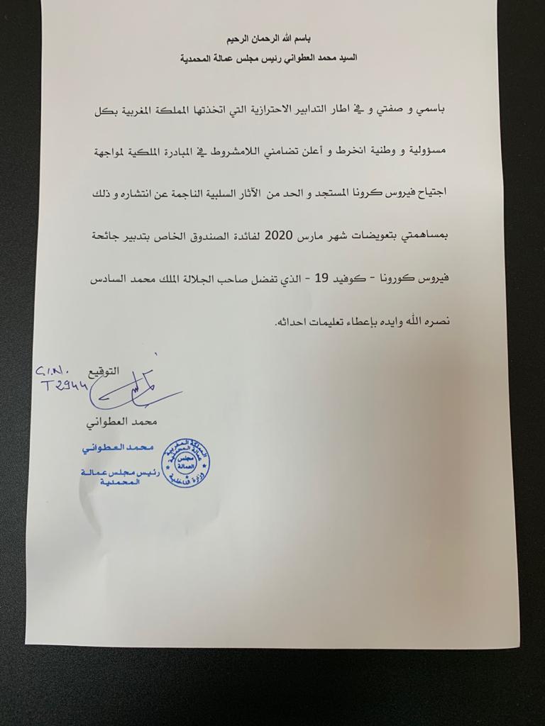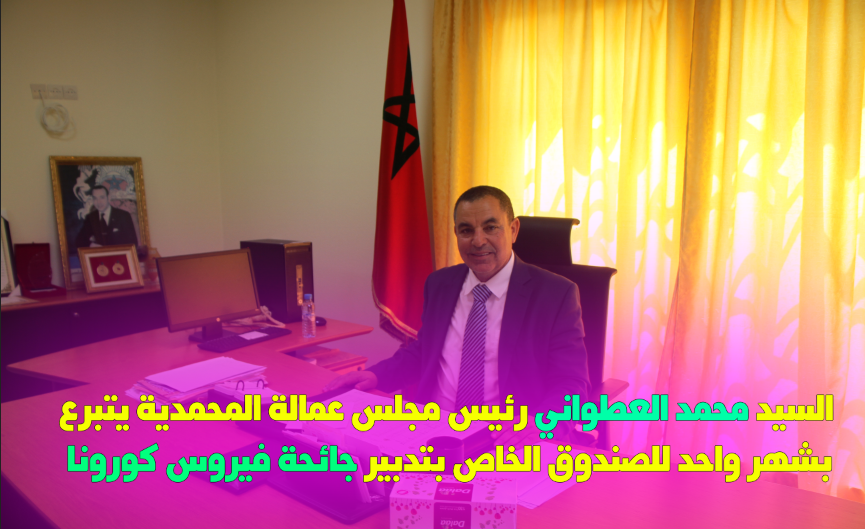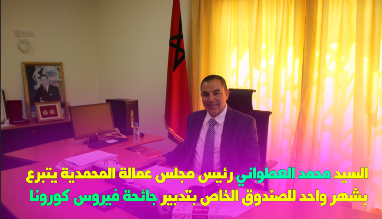 أعلن السيد محمد العطواني رئيس مجلس عمالة المحمدية تبرعه عن شهر واحد (مارس 2020) لفائدة الصندوق الخاص بمواجهة فيروس كورونا (كوفيد 19)، والذي تفضل جلالة الملك محمد السادس بإعطاء تعليمات إحداثه.