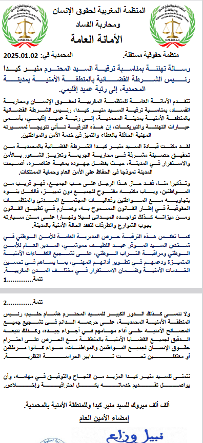 رسالة تهنئة بمناسبة ترقية السيد المحترم منير كيدا، رئيس الشرطة القضائية بالمنطقة الأمنية بمدينة المحمدية، إلى رتبة عميد إقليمي.