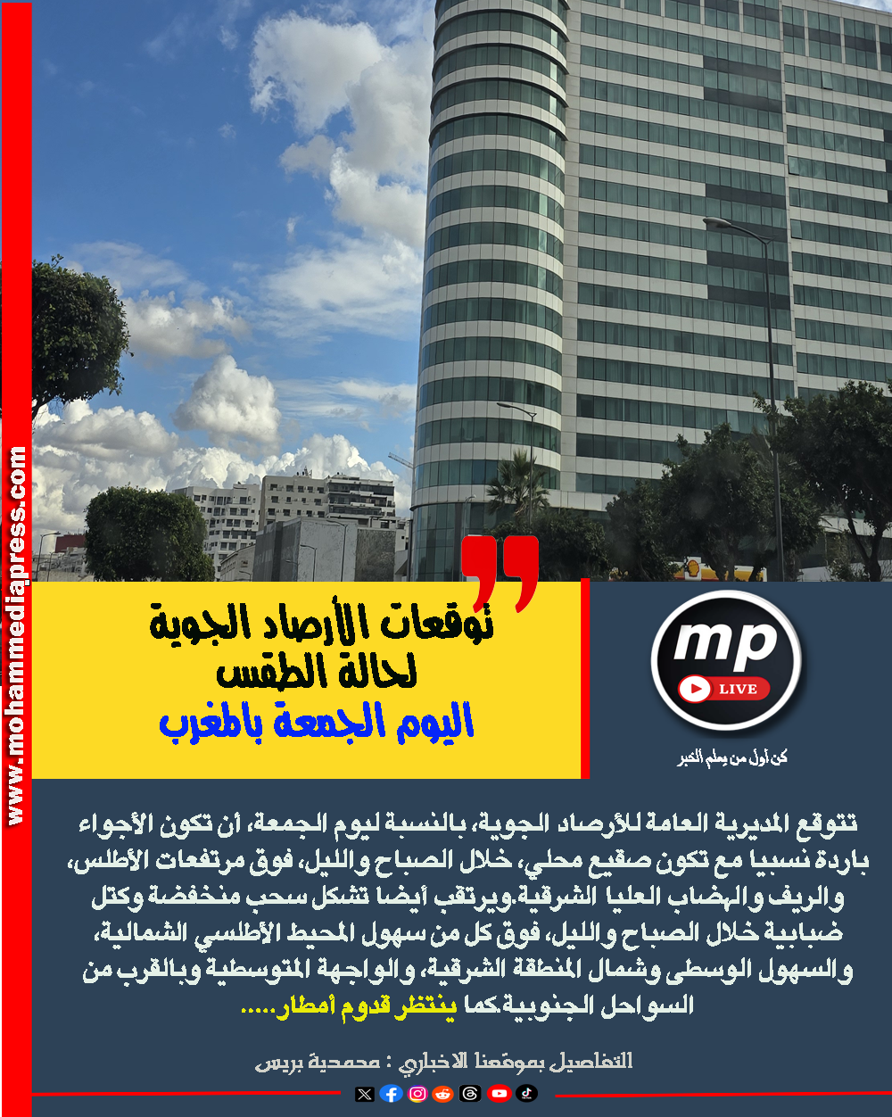 ويرتقب أيضا تشكل سحب منخفضة وكتل ضبابية خلال الصباح والليل، فوق كل من سهول المحيط الأطلسي الشمالية، والسهول الوسطى وشمال المنطقة الشرقية، والواجهة المتوسطية وبالقرب من السواحل الجنوبية.