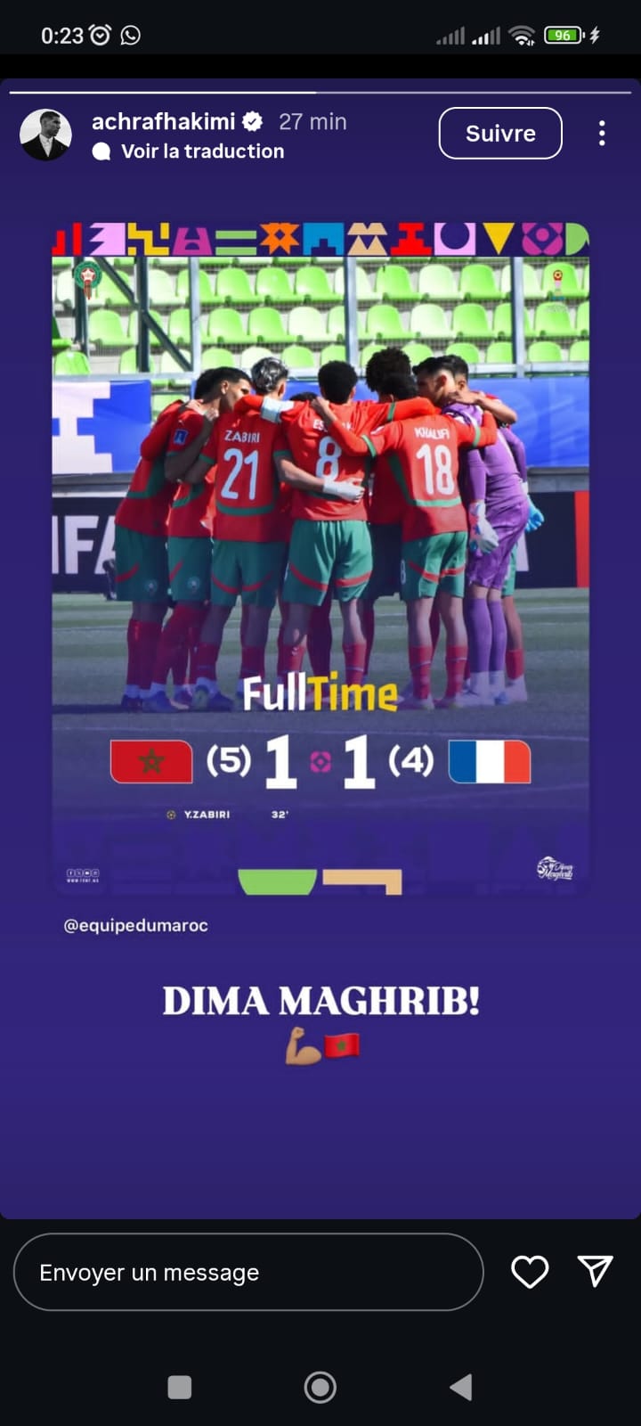 ونشر حكيمي عبر خاصية “الستوري” في حسابه على “إنستغرام” صورة لاحتفالات اللاعبين بعد المباراة، مرفقة بعبارة “Dima Maghrib” وعلم المغرب مع رمز القوة، في رسالة دعم تعكس ارتباطه العميق بمنتخب بلاده والجيل الجديد من النجوم الصاعدين.