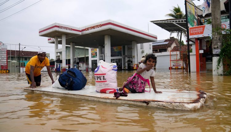 A man uses a makeshift raft to navigate a flooded street in Colombo, Sri Lanka, Saturday, Nov. 29, 2025. (AP Photo/Eranga Jayawardena)
