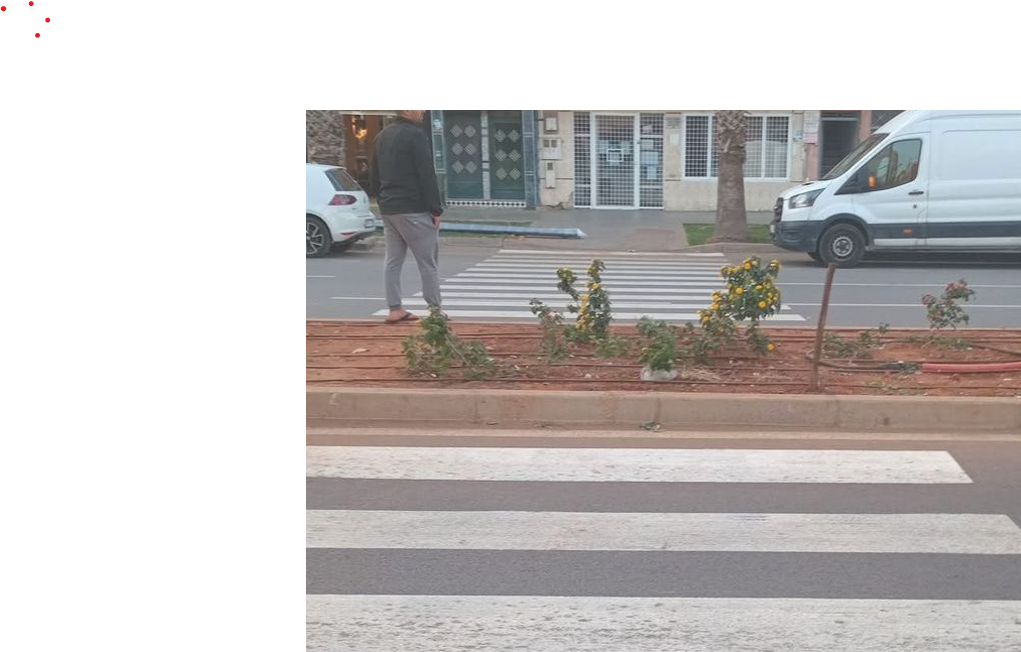ويُظهر المشهد، كما توثقه الصورة، وجود ممر واضح بخطوطه البيضاء، غير أن المسار الطبيعي للراجلين يصطدم بحاجز نباتي في الجزيرة الوسطية، ما يفرض على مستعملي الطريق الالتفاف أو مغادرة الممر، في وضعية قد تعرّضهم لخطر حوادث السير.