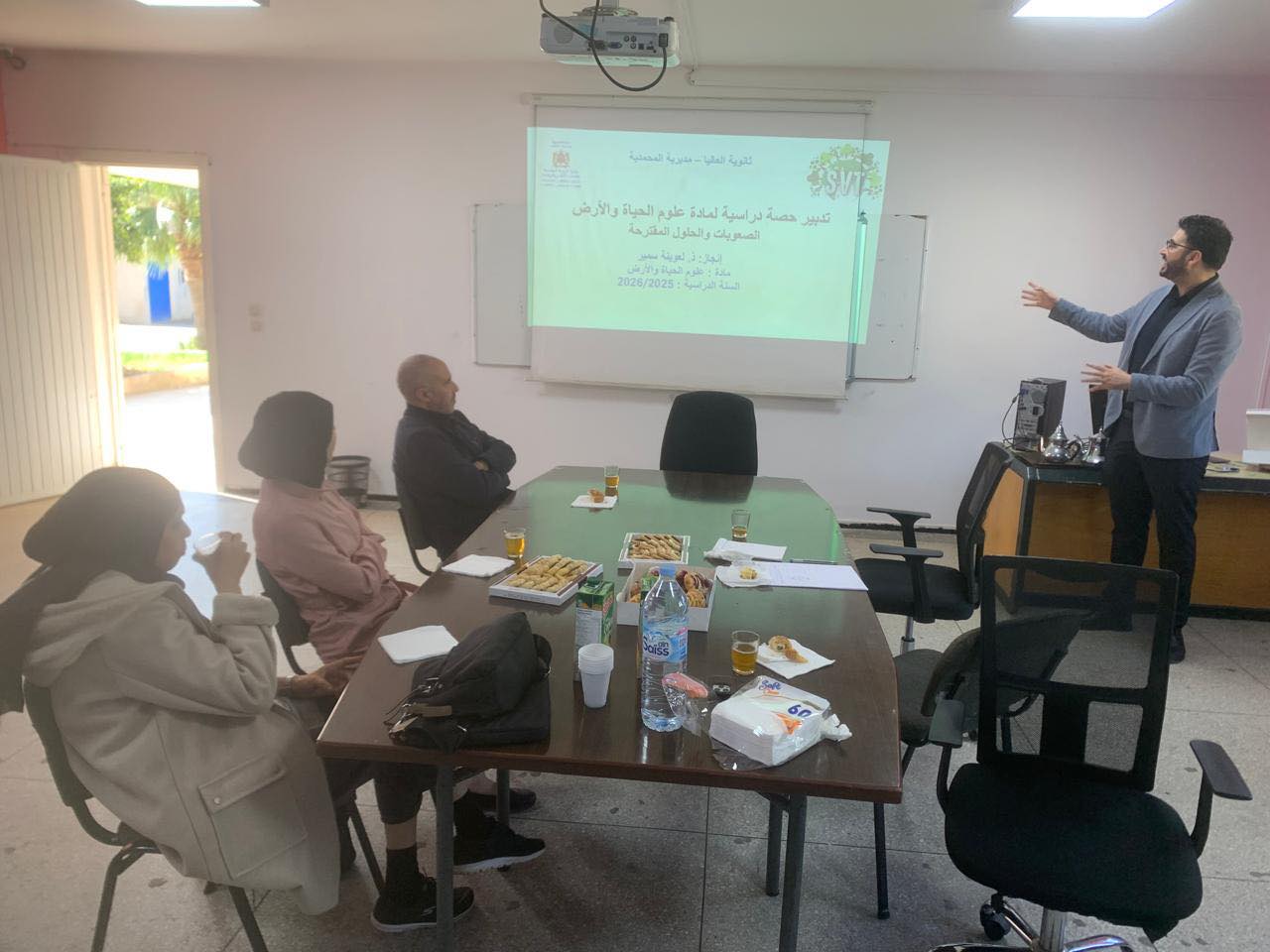 شكل العرض الذي أطره الأستاذ سمير لعوينة، بتنسيق مع السيد مفتش المادة، محطة هامة لتحليل الجوانب المعقدة لتدبير حصة “SVT”. وقد تميز اللقاء بحضور وازن شمل ناظر المؤسسة، السيد الموجه التربوي، ومجموعة من أساتذة المادة، حيث انصب النقاش على التحديات الديداكتيكية والبيداغوجية التي تواجه المدرس والمتعلم داخل المختبرات والفصول الدراسية.