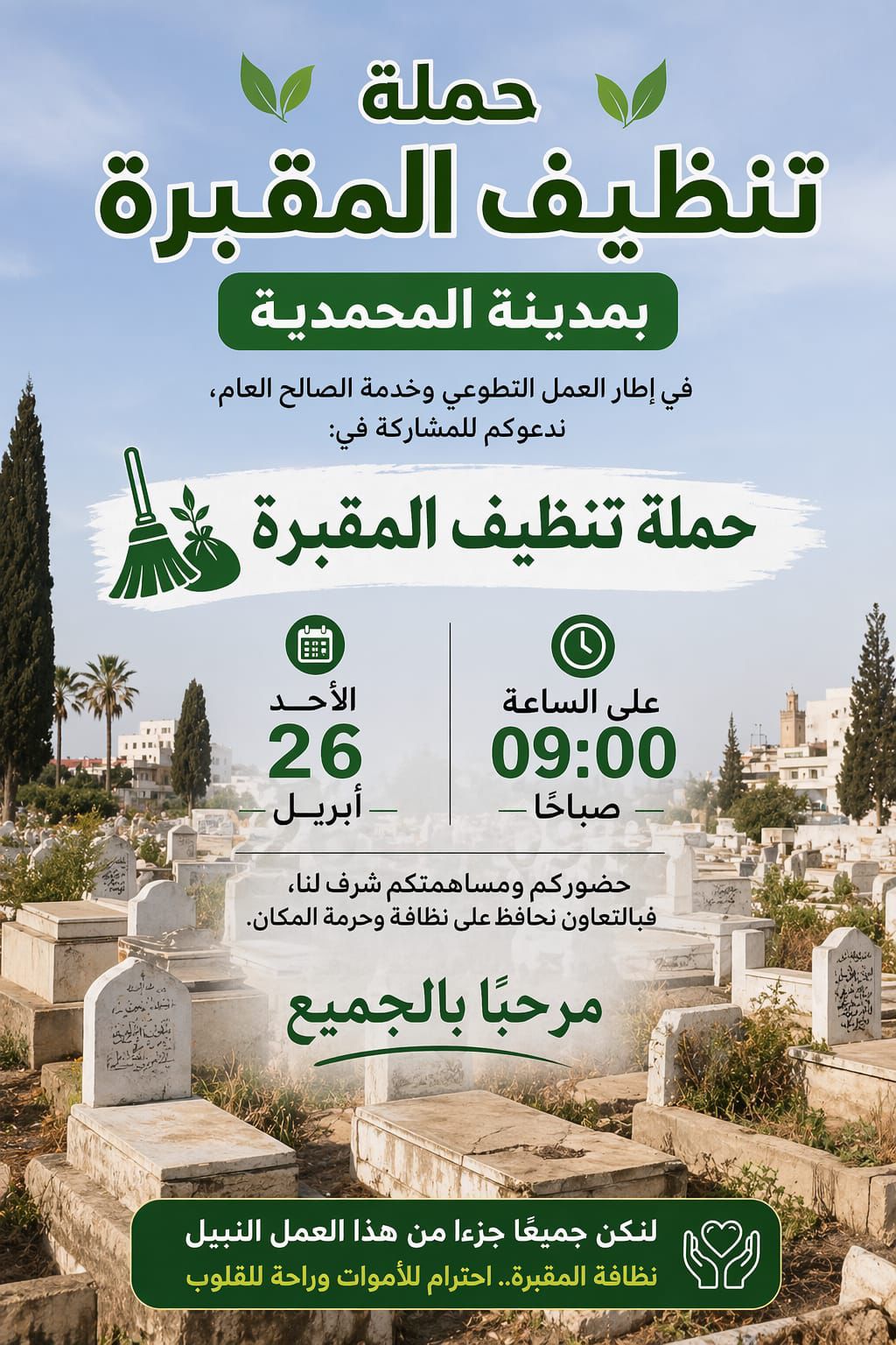 اعلان عن انطلاق حملة تطوعية كبرى لتنظيف مقبرة مدينة المحمدية تحت شعار “نظافة المقبرة.. احترام للأموات وراحة للقلوب”