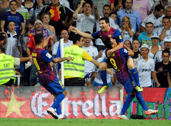 في لقاء مثير تعادل ريال مدريد بطل كأس إسبانيا مع ضيفه برشلونة حامل لقب الدوري بهدفين لكل فريق في لقائهما ذهاباً في بطولة كأس السوبر الإسبانية مساء الأحد على ملعب سانتياغو برنابيو في العاصمة الإسبانية مدريد. تقدم ريال مدريد في الدقيقة 13 بهدف للاعب الوسط الألماني مسعود أوزيل، وتعادل لبرشلونة دافيد فيا في الدقيقة 36، وأضاف النجم الأرجنتيني ليونيل ميسي الهدف الثاني لبرشلونة في الدقيقة الأخيرة من الشوط الأول، وفي الشوط الثاني نجح تشابي ألونسو في إحراز هدف التعادل لريال مدريد في الدقيقة 54.